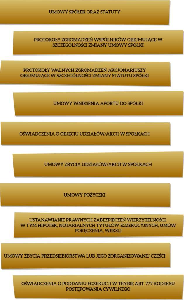 Do typowych czynności należy przygotowanie umowy spółki lub statutu oraz ich zmiany, a także kwestie związane ze zmianami właścicielskimi (zbycia udziałów/akcji, przyjmowanie nowych wspólników) w podmiotach gospodarczych oraz zmiany ich formy prawnej poprzez przekształcania, np. przedsiębiorcy prowadzącego działalność gospodarczą w spółkę prawa handlowego.